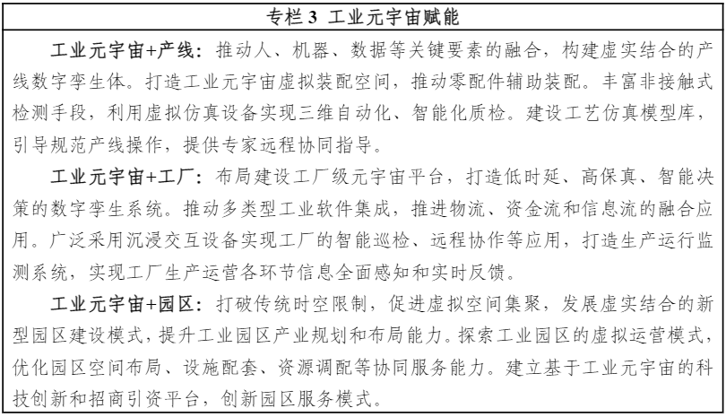 4.探索推动工业关键流程的元宇宙化改造。建设工业元宇宙基础通用模型数据库,打造高精度、可交互的工业虚拟映射空间。建设工业元宇宙仿真设计与验证平台,布局生产环节应用,提升设计阶段有效性和生产阶段效率。探索基于元宇宙的产线运维、产品检测新模式,强化预测性维护,提高运维检测效率和服务质量。打造基于工业元宇宙的营销平台和虚拟培训系统,提供沉浸式销售和培训环境。
